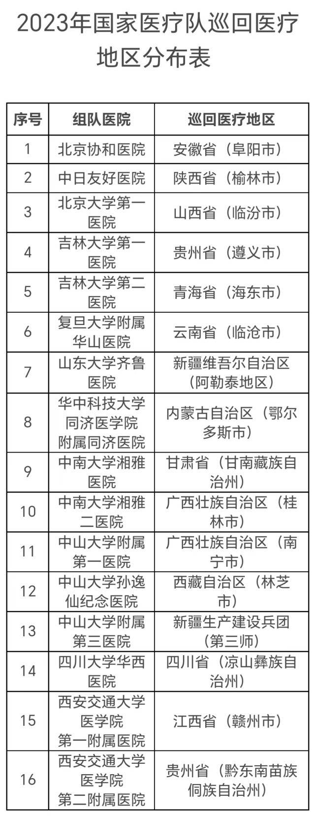 國家醫(yī)療隊的組隊醫(yī)院包括北京協(xié)和醫(yī)院、中日友好醫(yī)院等16家,分赴安徽、陜西等地,派出時間為6—10月。每支國家醫(yī)療隊不少于5人,以副高及以上職稱的醫(yī)務(wù)人員為主,重點(diǎn)開展巡回醫(yī)療、技術(shù)和管理指導(dǎo)、人員培訓(xùn)、加強(qiáng)遠(yuǎn)程醫(yī)療協(xié)作網(wǎng)建設(shè)等工作。工作時間不少于3周,其中在縣域開展工作的時間不少于兩周。