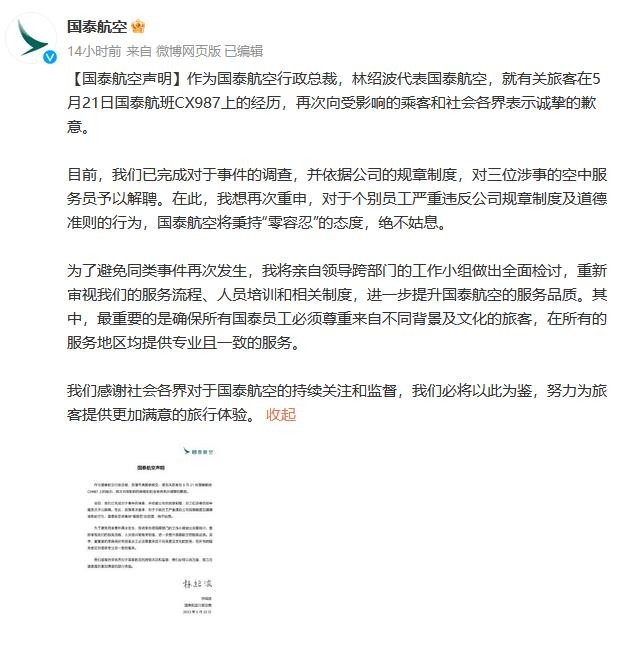 國泰航空三度致歉 解雇3名涉事乘務(wù)員