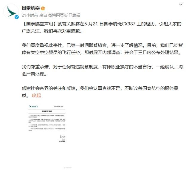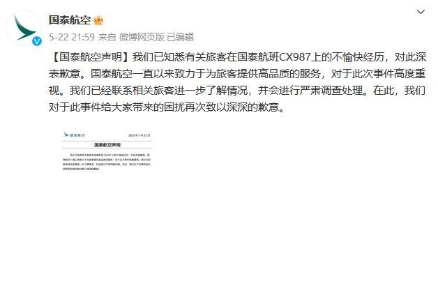 23日,國泰再次發(fā)聲明稱,已第一時間聯(lián)系旅客,目前已經(jīng)暫停有關(guān)乘務(wù)員的飛行任務(wù),即時展開內(nèi)部調(diào)查,并會于三日內(nèi)公布處理結(jié)果。