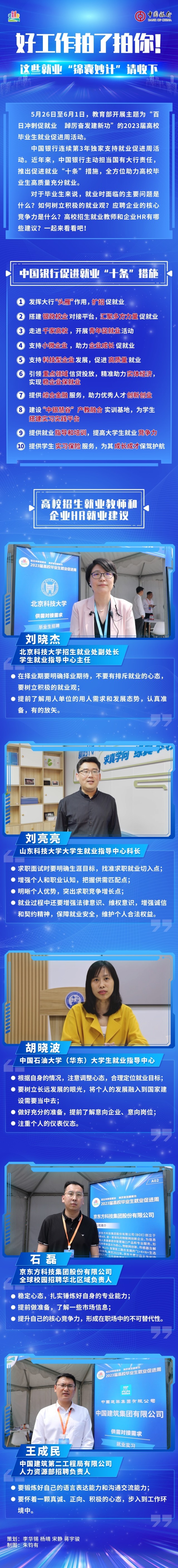 5月26日至6月1日,教育部開展主題為“百日沖刺促就業(yè)距厲奮發(fā)建新功”的2023屆高校畢業(yè)生就業(yè)促進周活動。中國銀行連續(xù)第3年獨家支持就業(yè)促進周活動。近年來,中國銀行主動擔當國有大行責任推出促進就業(yè)“十條”措施,全方位助力高校畢業(yè)生高質量充分就業(yè)。對于畢業(yè)生來說,就業(yè)時面臨的主要問題是什么? 如何樹立積極的就業(yè)觀? 應聘企業(yè)的核心競爭力是什么? 高校招生就業(yè)教師和企業(yè)HR有哪些建議? 一起來看看吧?。ㄖ袊嗄昃W(wǎng)記者 李華錫 楊晴 宋靜 蔣宇駿 朱鈞有)