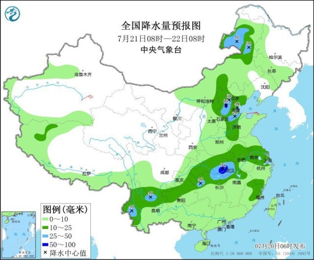 圖1 全國降水量預(yù)報(bào)圖(7月20日08時(shí)-21日08時(shí))