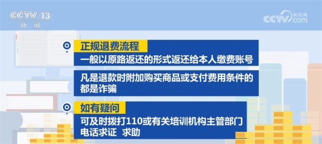 正規(guī)退費(fèi)流程一般以原路返還的形式返還給本人繳費(fèi)賬號(hào),凡是退款時(shí)附加購買商品或支付費(fèi)用條件的都是詐騙。如有疑問,可及時(shí)撥打110或有關(guān)培訓(xùn)機(jī)構(gòu)主管部門電話求證、求助。