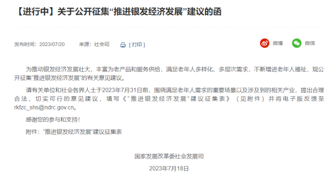 國家發(fā)改委:現(xiàn)公開征集“推進(jìn)銀發(fā)經(jīng)濟(jì)發(fā)展”的有關(guān)意見建議