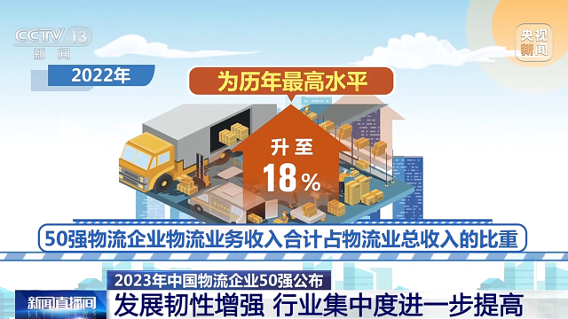 中國物流與采購聯(lián)合會今天發(fā)布了2023年度中國物流企業(yè)50強。從物流業(yè)務收入占比來看,50強物流企業(yè)的物流業(yè)務收入占物流業(yè)總收入的比重升至歷年最高,并且50強物流企業(yè)門檻大幅提高,顯示物流行業(yè)發(fā)展韌性較強,行業(yè)集中度進一步提高。