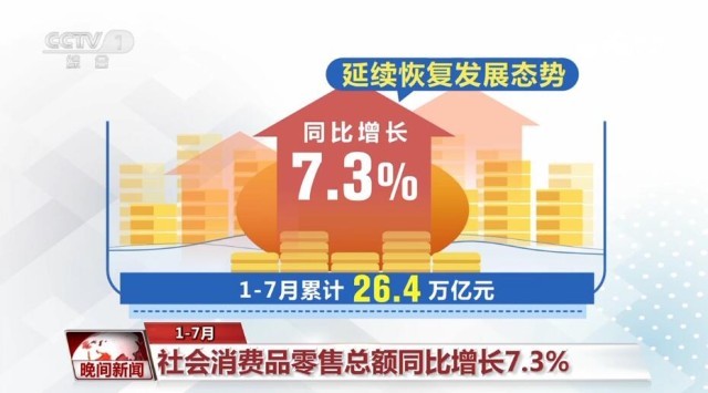 數據四:增長7.3%。商務部8月18日介紹,7月份,各地組織開展暑期消費季、國際消費季等活動,著力推動消費。在這些舉措的帶動下,7月份,社會消費品零售總額同比增長2.5%。