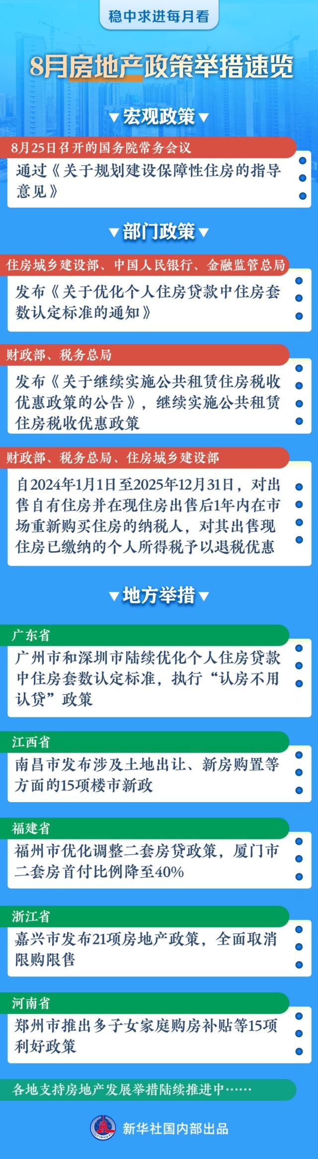 近段時間,相關(guān)部門陸續(xù)釋放地產(chǎn)領(lǐng)域積極政策信號:8月初,中國人民銀行在部署下半年工作時明確提出“繼續(xù)引導(dǎo)個人住房貸款利率和首付比例下行”;近日,住房城鄉(xiāng)建設(shè)部等三部門給出了“認(rèn)房不認(rèn)貸”政策具體實施標(biāo)準(zhǔn);財政部還公布了兩項針對房地產(chǎn)市場的稅收優(yōu)惠政策。
