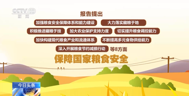 報告提出,將從加強糧食安全保障體系和能力建設(shè)、大力落實藏糧于地、積極推進藏糧于技、加大農(nóng)業(yè)保護支持力度、切實提升糧食調(diào)控能力、加快構(gòu)建現(xiàn)代糧食產(chǎn)業(yè)和流通體系、不斷提高多元食物供給能力、深入開展糧食節(jié)約減損行動等8方面,保障國家糧食安全。