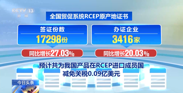 中國貿(mào)促會8月30日介紹:今年7月份,全國貿(mào)促系統(tǒng)累計簽發(fā)原產(chǎn)地證書等各類證書54.62萬份,較上年同比增長12.82%。全國貿(mào)促系統(tǒng)RCEP原產(chǎn)地證書簽證份數(shù)為17298份,同比增長27.03%;辦證企業(yè)3416家,同比增長20.03%,預(yù)計共為我國產(chǎn)品在RCEP進口成員國減免關(guān)稅0.09億美元。