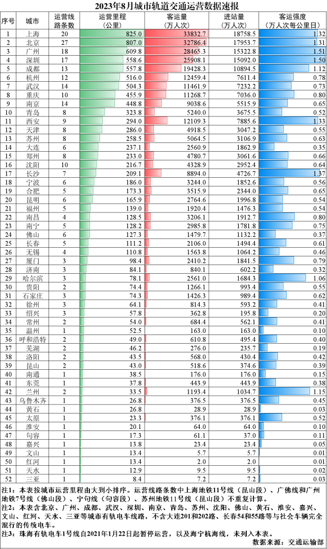 央視網(wǎng)消息:交通運(yùn)輸部發(fā)布2023年8月城市軌道交通運(yùn)營數(shù)據(jù)速報,2023年8月,31個?。ㄗ灾螀^(qū)、直轄市)和新疆生產(chǎn)建設(shè)兵團(tuán)共有54個城市開通運(yùn)營城市軌道交通線路297條,運(yùn)營里程9771.8公里,實際開行列車325萬列次,完成客運(yùn)量27.1億人次,進(jìn)站量16.3億人次。8月份,客運(yùn)量環(huán)比增加0.4億人次、增長1.7%,同比增加7.5億人次、增長38.4%,較2019年月均客運(yùn)量增加7.2億人次、增長36.0%。8月份客運(yùn)強(qiáng)度平均水平為0.556萬人次每公里日,較2019年全年客運(yùn)強(qiáng)度平均水平增長1.9%。