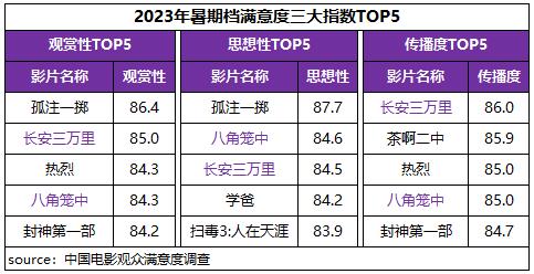 從影片的三大指數(shù)來看,《孤注一擲》觀賞性、思想性居檔期第一,《長安三萬里》傳播度居檔期第一,《八角籠中》三大指數(shù)均居檔期前三。另外,《熱烈》和《封神第一部》觀賞性創(chuàng)作表現(xiàn)較為亮眼,《學(xué)爸》和《掃毒3:人在天涯》思想性塑造突出;傳播度方面,兩部動畫影片《長安三萬里》《茶啊二中》表現(xiàn)優(yōu)異,居近三年同期調(diào)查35部影片的第二、第三位。這些影片以優(yōu)質(zhì)創(chuàng)作為觀眾打造暑期視聽盛宴和精神大餐,觀眾形成“自來水”積極為影片加油“打call”,二者雙向奔赴,造就持續(xù)火熱的檔期氛圍。