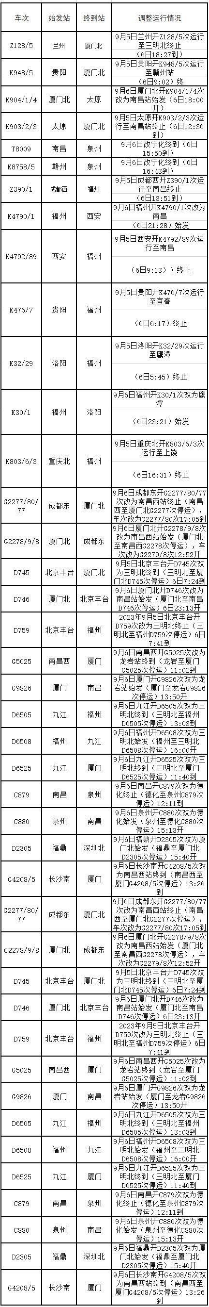 受臺(tái)風(fēng)“海葵”殘余環(huán)流影響,預(yù)計(jì)9月6日8時(shí)至7日8時(shí),福建東部和南部、江西南部等地有大到暴雨,其中福建東南部沿海部分地區(qū)有大暴雨,局地有雷暴大風(fēng)等強(qiáng)對(duì)流天氣。為確保人民生命財(cái)產(chǎn)安全和鐵路運(yùn)輸安全,中國鐵路南昌局集團(tuán)有限公司(以下簡稱南鐵)調(diào)整9月6日、7日部分旅客列車運(yùn)行方案(具體見附件)。