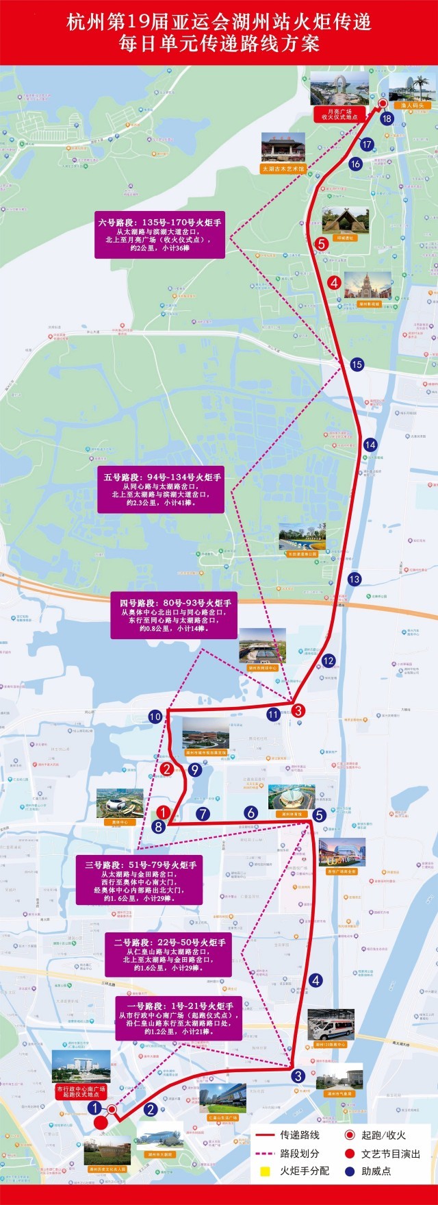 本次傳遞以“在湖州看見美麗中國”為主題,傳遞路線從湖州市行政中心南廣場出發(fā),沿仁皇山路—太湖路—金田路—奧體中心—同心路—太湖路進(jìn)行傳遞,最后到達(dá)南太湖月亮廣場,舉行收火儀式。