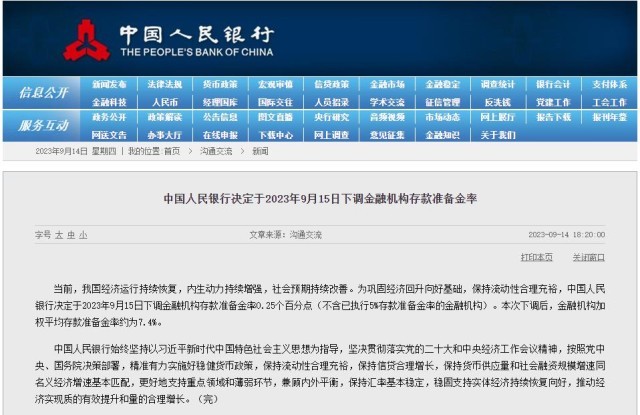 央視網(wǎng)消息:中國人民銀行9月14日公告,決定于2023年9月15日下調(diào)金融機(jī)構(gòu)存款準(zhǔn)備金率0.25個百分點(不含已執(zhí)行5%存款準(zhǔn)備金率的金融機(jī)構(gòu))。本次下調(diào)后,金融機(jī)構(gòu)加權(quán)平均存款準(zhǔn)備金率約為7.4%。