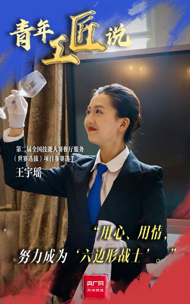 370余個考核點,對于第二屆全國技能大賽餐廳服務(wù)(世賽選拔)項目參賽選手王宇瑤來說,有著巨大的考驗。但面對困難,王宇瑤始終保持微笑,在老師的指導(dǎo)下練習(xí)調(diào)制雞尾酒、餐巾折花、餐桌擺盤成百上千次。整齊的著裝、得體大方的儀容、神采奕奕的狀態(tài),一顰一笑皆為王宇瑤的細(xì)心巧思。“我將以此次比賽為契機(jī),努力磨煉技藝,成為一名全面發(fā)展的‘六邊形戰(zhàn)士’?!蓖跤瞵幮χf道。