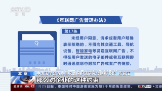 中國(guó)法學(xué)會(huì)消費(fèi)者權(quán)益保護(hù)法研究會(huì)副秘書(shū)長(zhǎng) 陳音江:廣告法里面規(guī)定得就比較粗一些,任何單位或個(gè)人,你沒(méi)有經(jīng)過(guò)當(dāng)事人的同意,不能夠向這種住宅或者說(shuō)交通設(shè)施上去投放廣告,但是用的是“等”,就沒(méi)有這么具體。修訂實(shí)施的《互聯(lián)網(wǎng)廣告管理辦法》里面,它就明確地說(shuō)了包括智能家電,你沒(méi)有經(jīng)過(guò)同意,你也不能夠往它里面去發(fā)送這種廣告。這幾年,針對(duì)智能家電的這種廣告它的規(guī)定越來(lái)越具體,那么對(duì)企業(yè)的這種約束也應(yīng)該是越來(lái)越具體,或者說(shuō)它這種合規(guī)的紅線越來(lái)越明確。