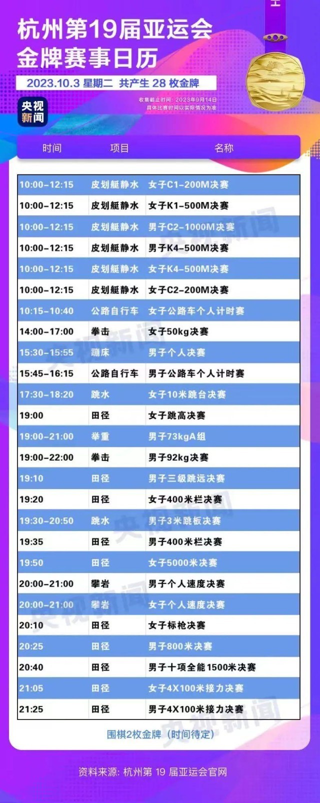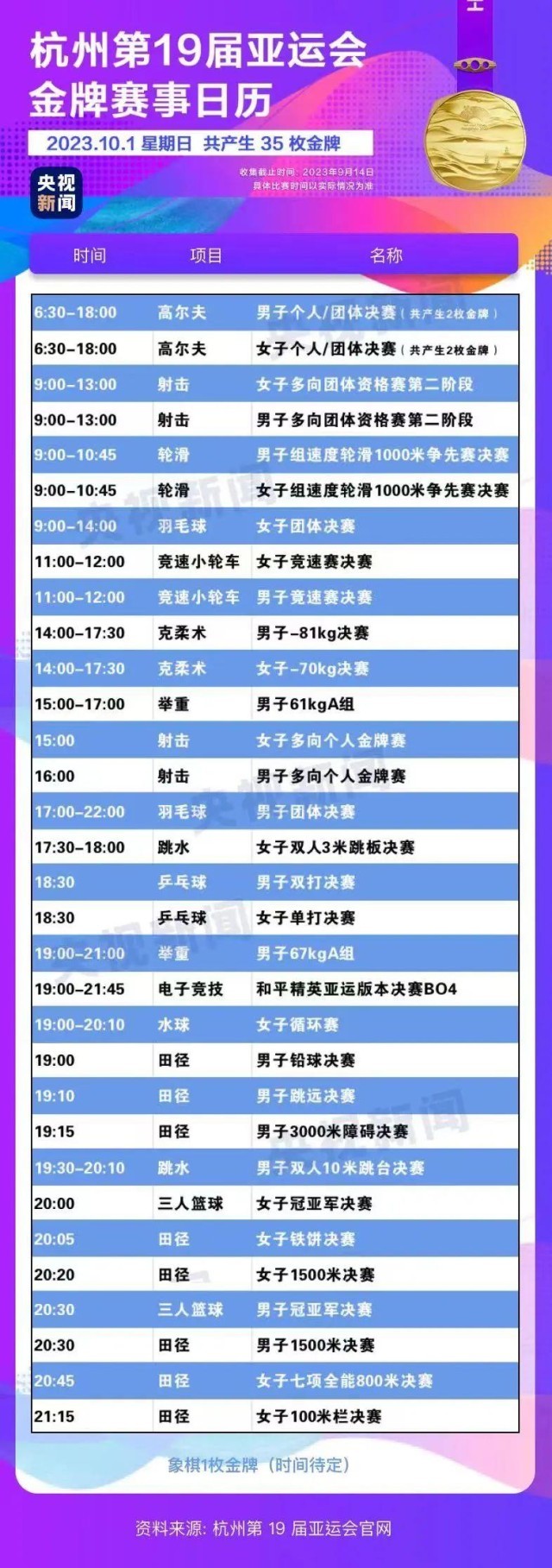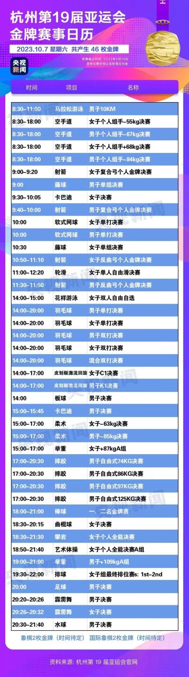 最后,小編還為你準備了一份杭州亞運會金牌賽事日歷,日歷里包含所有481枚金牌產(chǎn)生的時間?;瑒邮种福纯茨汴P(guān)注的比賽在哪天舉行。