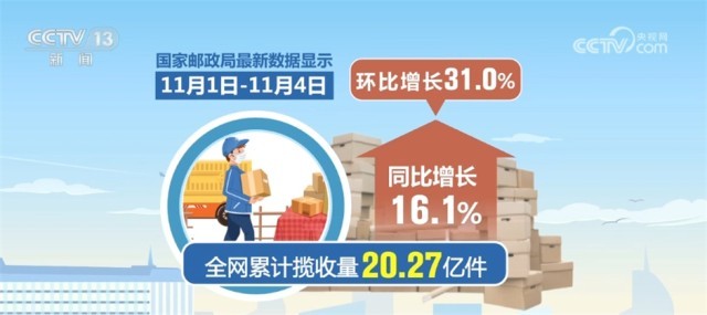國(guó)家郵政局今天(11月5日)發(fā)布,快遞業(yè)從11月開(kāi)始迎來(lái)業(yè)務(wù)旺季。最新數(shù)據(jù)顯示,11月1日至11月4日,全網(wǎng)累計(jì)攬收量20.27億件,同比增長(zhǎng)16.1%,環(huán)比增長(zhǎng)31.0%。今年快遞業(yè)務(wù)旺季從11月1日開(kāi)始,到2024年春節(jié)前夕結(jié)束,時(shí)長(zhǎng)102天。