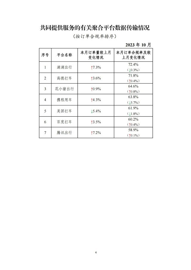 一、在訂單量前10名的網(wǎng)約車平臺(tái)中,訂單合規(guī)率最高的是如祺出行,最低的是花小豬出行。在訂單量前10名的平臺(tái)中,按訂單合規(guī)率(指駕駛員和車輛均獲得許可的訂單量占比)從高到低的分別是如祺出行、享道出行、萬(wàn)順叫車、及時(shí)用車、T3出行、攜華出行、陽(yáng)光出行、曹操出行、滴滴出行、花小豬出行。本月訂單合規(guī)率增長(zhǎng)前3名的依次是曹操出行、萬(wàn)順叫車、陽(yáng)光出行;增長(zhǎng)最后3名的依次是享道出行(-0.7%)、T3出行(-1.0%)、攜華出行(-6.7%)。
