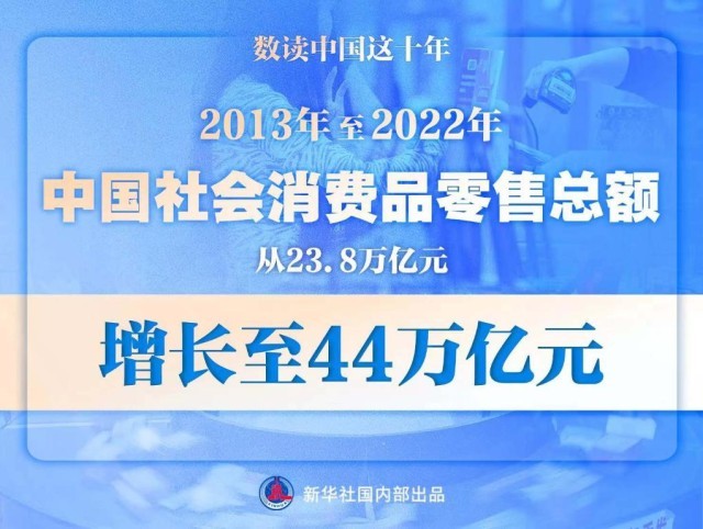 2013年至2022年10年間,中國(guó)社會(huì)消費(fèi)品零售總額從23.8萬(wàn)億元增長(zhǎng)至44萬(wàn)億元,穩(wěn)居全球第二大消費(fèi)市場(chǎng)、第一大網(wǎng)絡(luò)零售市場(chǎng)和全球第二大進(jìn)口市場(chǎng)。消費(fèi)“主引擎”動(dòng)力強(qiáng)勁,為推動(dòng)高質(zhì)量發(fā)展、創(chuàng)造高品質(zhì)生活、構(gòu)建新發(fā)展格局提供有力支撐。