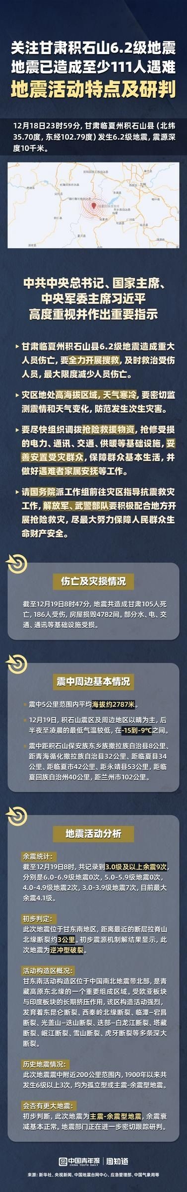 地震專家表示余震衰減基本正常,甘肅積石山6.2級(jí)地震救援正在緊張進(jìn)行中。截至12月19日8時(shí),共記錄到3.0級(jí)及以上余震9次。這次地震有何特點(diǎn)?周邊基本海拔、溫度情況如何?歷史上發(fā)生過哪些地震?是否會(huì)有更大的地震出現(xiàn)?中國(guó)地震臺(tái)網(wǎng)中心專家作出初步研判。