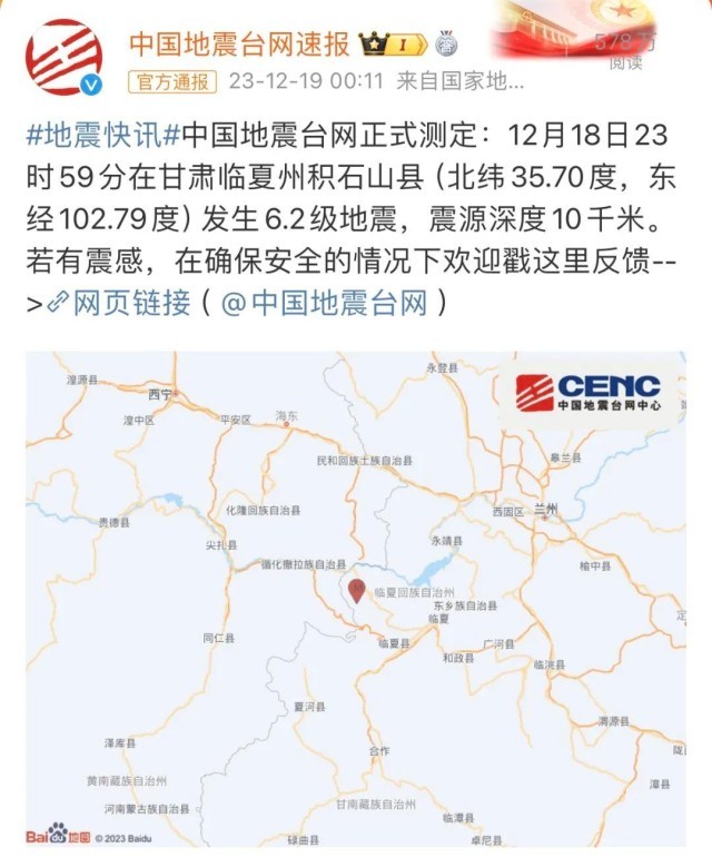 12月18日23時(shí)59分,甘肅臨夏州積石山縣發(fā)生6.2級(jí)地震,震源深度10公里,距離最近高鐵線路近60公里,甘肅多地震感明顯。