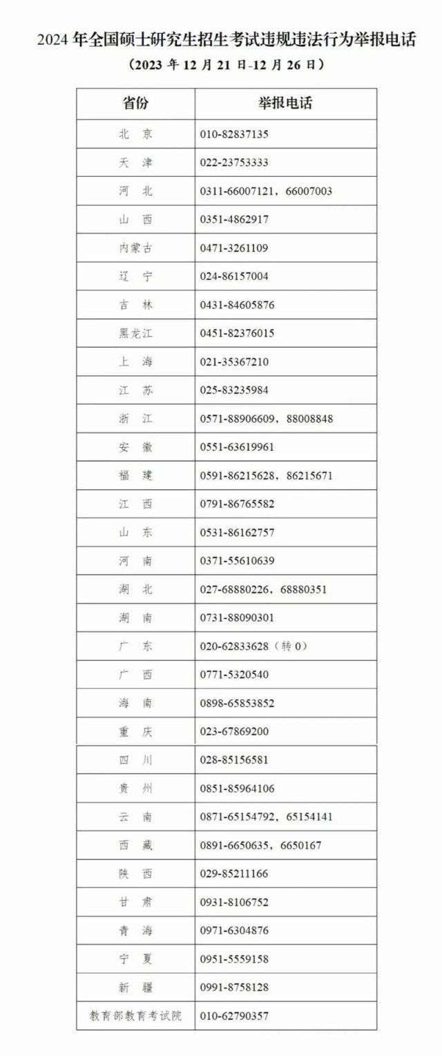 教育部和各省(區(qū)、市)教育招生考試機(jī)構(gòu)將開通2024年研考舉報(bào)電話,考生及社會(huì)各界人士可及時(shí)舉報(bào)反映有關(guān)問題線索。教育部及各省(區(qū)、市)將會(huì)同有關(guān)部門根據(jù)舉報(bào)線索第一時(shí)間核查處理,堅(jiān)決維護(hù)風(fēng)清氣正的研考環(huán)境。