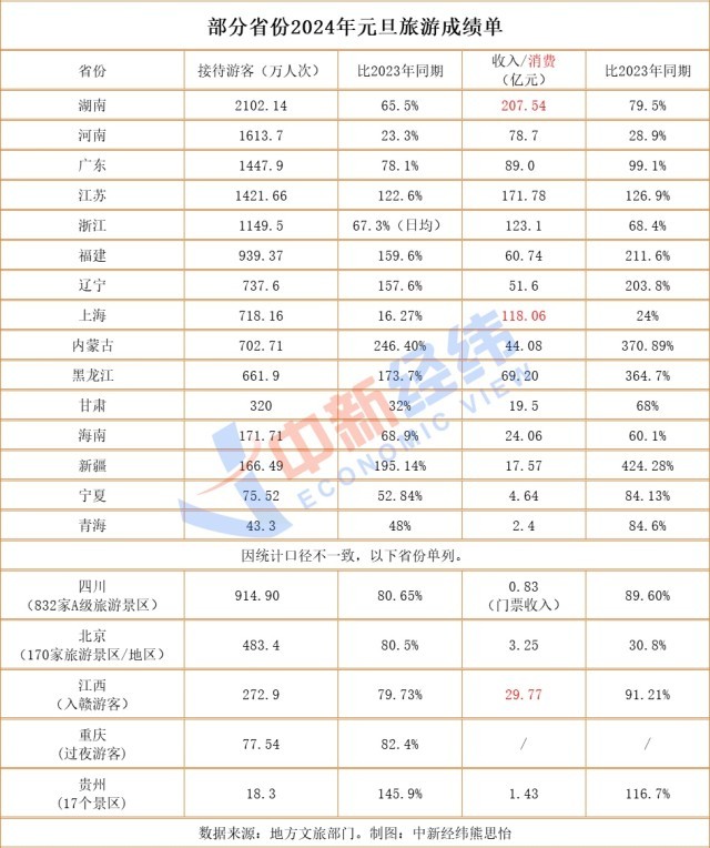 據(jù)中新經(jīng)緯不完全統(tǒng)計(jì),截至1月3日21時(shí),全國已有20省份發(fā)布2024年元旦旅游數(shù)據(jù)。其中,湖南接待游客2102.14萬人次,暫時(shí)領(lǐng)跑全國;河南接待游客1613.7萬人次,位列第二;廣東接待游客1447.9萬,排名第三。此外,江蘇、浙江兩省游客接待量也超過千萬。