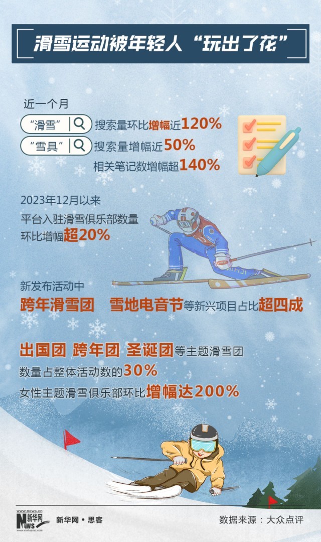 大眾點(diǎn)評數(shù)據(jù)顯示,2023年12月以來,滑雪俱樂部入駐數(shù)量環(huán)比增幅超20%。新發(fā)布活動(dòng)中,雪地電音節(jié)、滑雪旅行團(tuán)等新興項(xiàng)目占比超四成?!盎彼阉髁凯h(huán)比增幅近120%,“雪具”搜索量增幅近50%,相關(guān)筆記數(shù)增幅超140%。很多“95后”網(wǎng)友表示,自己一直都想滑雪,在網(wǎng)絡(luò)上看到一些“滑雪+電音節(jié)”的筆記攻略,被這種新穎的形式吸引,立刻“種草”。