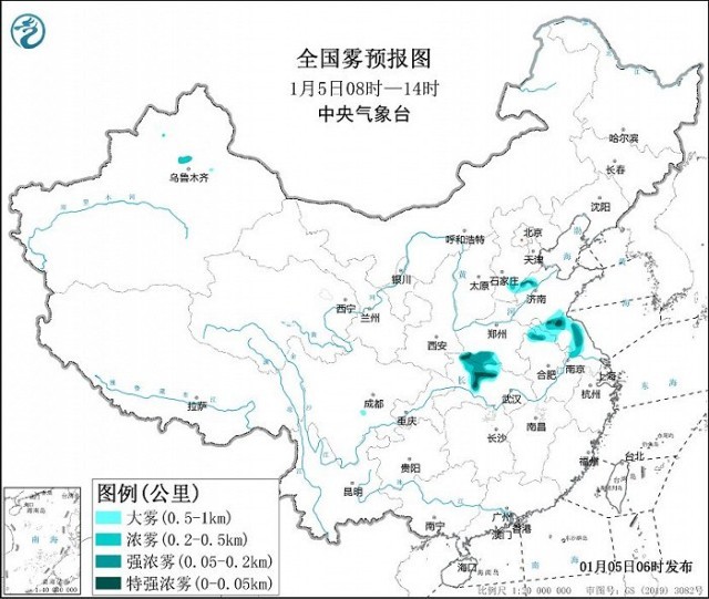 中央氣象臺(tái)1月5日06時(shí)繼續(xù)發(fā)布大霧黃色預(yù)警