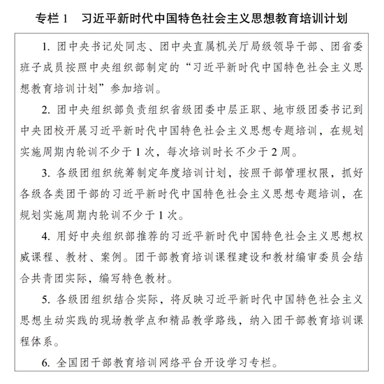 ?。ㄒ唬┚劢咕哿?,久久為功。完善團(tuán)干部理論教育培訓(xùn)長(zhǎng)效機(jī)制,落實(shí)黨的創(chuàng)新理論學(xué)習(xí)教育計(jì)劃,組織實(shí)施習(xí)近平新時(shí)代中國(guó)特色社會(huì)主義思想教育培訓(xùn)計(jì)劃(專欄1),系統(tǒng)謀劃、持續(xù)用力,不斷把思想鑄魂、理論武裝工作引向深入。堅(jiān)持把習(xí)近平新時(shí)代中國(guó)特色社會(huì)主義思想作為團(tuán)的各級(jí)領(lǐng)導(dǎo)機(jī)關(guān)班子成員理論學(xué)習(xí)中心組學(xué)習(xí)首要內(nèi)容,作出具體安排、精心組織實(shí)施;作為各級(jí)團(tuán)干部教育培訓(xùn)機(jī)構(gòu)的主課必修課,辦好理論進(jìn)修班、理論研修班;作為團(tuán)干部學(xué)習(xí)的中心內(nèi)容,全面系統(tǒng)學(xué)、持續(xù)深入學(xué)、聯(lián)系實(shí)際學(xué)。以縣處級(jí)及以上團(tuán)干部為重點(diǎn),開展習(xí)近平新時(shí)代中國(guó)特色社會(huì)主義思想和黨的二十大精神集中輪訓(xùn);深入開展主題教育,通過(guò)專題學(xué)習(xí)、研討交流、主題黨課、調(diào)查研究、建章立制等形式,推動(dòng)黨的創(chuàng)新理論學(xué)習(xí)教育走深走實(shí)走心,使廣大團(tuán)干部更加深刻領(lǐng)悟“兩個(gè)確立”的決定性意義,更加自覺(jué)增強(qiáng)“四個(gè)意識(shí)”、堅(jiān)定“四個(gè)自信”、做到“兩個(gè)維護(hù)”。深入開展習(xí)近平總書記關(guān)于青年工作的重要思想學(xué)習(xí)培訓(xùn),使廣大團(tuán)干部學(xué)習(xí)掌握黨的青年工作的地位作用、目標(biāo)任務(wù)、職責(zé)使命、實(shí)踐要求,為做好新時(shí)代新征程黨的青年工作打牢思想基礎(chǔ)。