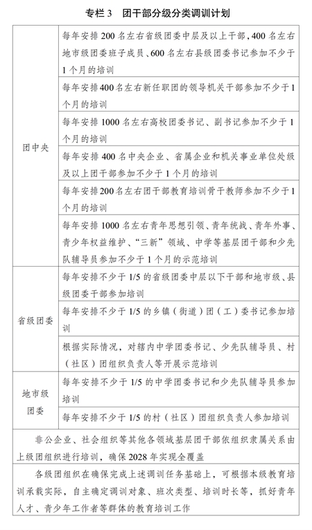 ?。ǘ﹫?jiān)持分級(jí)分類。根據(jù)各級(jí)團(tuán)的領(lǐng)導(dǎo)機(jī)關(guān)干部、高校團(tuán)干部、國(guó)有企業(yè)和機(jī)關(guān)事業(yè)單位單位團(tuán)干部、中學(xué)團(tuán)干部、鄉(xiāng)鎮(zhèn)(街道)團(tuán)(工)委書記、村(社區(qū))團(tuán)組織負(fù)責(zé)人、非公企業(yè)、社會(huì)組織等其他各領(lǐng)域基層團(tuán)干部的不同對(duì)象特點(diǎn),把團(tuán)干部履職能力培訓(xùn)的普遍性要求與不同類別、不同層級(jí)、不同崗位團(tuán)干部的特殊需要結(jié)合起來(lái),整合優(yōu)質(zhì)資源,加強(qiáng)團(tuán)干部教育培訓(xùn)機(jī)構(gòu)與黨校(行政學(xué)院)、干部學(xué)院、黨性教育基地等的合作聯(lián)動(dòng),多渠道多方面開展履職能力培訓(xùn),切實(shí)增強(qiáng)教育培訓(xùn)的時(shí)代性、系統(tǒng)性、針對(duì)性、有效性。發(fā)揮中央團(tuán)校、全國(guó)青少年井岡山革命傳統(tǒng)教育基地主體作用,圍繞黨的中心任務(wù)、黨中央重大決策部署和國(guó)家重大戰(zhàn)略需求開展專題培訓(xùn);發(fā)揮全國(guó)團(tuán)干部教育培訓(xùn)基地優(yōu)勢(shì),開展政策解讀、重點(diǎn)任務(wù)落實(shí)等專題培訓(xùn);發(fā)揮地方團(tuán)干部教育培訓(xùn)機(jī)構(gòu)優(yōu)勢(shì),開展基層團(tuán)干部實(shí)務(wù)培訓(xùn);發(fā)揮全國(guó)團(tuán)干部教育培訓(xùn)網(wǎng)絡(luò)平臺(tái)作用,抓好履職通識(shí)培訓(xùn);加強(qiáng)與派出單位、接收單位的協(xié)作,抓好援派幫扶干部人才、掛職干部等教育培訓(xùn)。積極創(chuàng)造條件,支持干部在職自學(xué)。實(shí)施團(tuán)干部分級(jí)分類調(diào)訓(xùn)計(jì)劃(專欄3)。