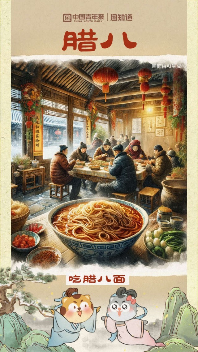 又是一年臘八時(shí),道一聲萬事“粥”全?!坝煤?、松子、乳蕈、柿、栗之類為粥,謂之‘臘八粥’?!边@是南宋周密筆下的臘八粥。你的“臘八”餐桌想擺上哪些地方的美食?①湖南湖北的熏臘肉②北方地區(qū)的臘八蒜、臘八醋③陜西關(guān)中地區(qū)臘八面……過了臘八就是年,幾幅臘八美食與你一起迎接小年。