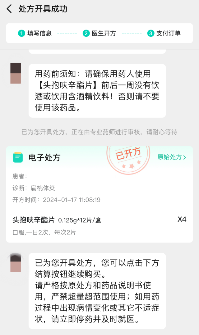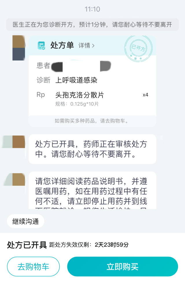 “您好,我是醫(yī)生XX,已收到您的復(fù)診開藥訴求,正在為您診斷開方,預(yù)計(jì)1分鐘,請(qǐng)不要離開……”自動(dòng)發(fā)來(lái)三條問(wèn)話后,記者并未回復(fù)任何信息,一份電子處方就順利開出。只需完成支付,處方藥就可以送貨上門。