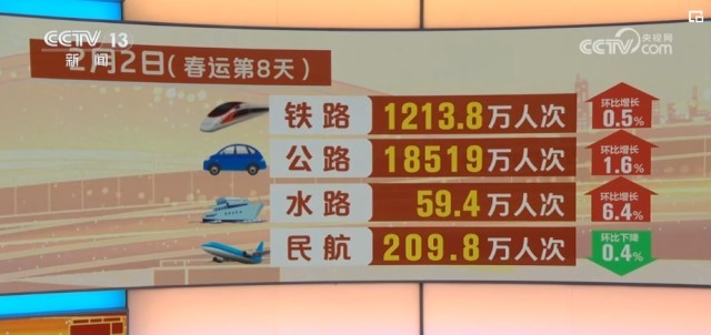 具體來看,2月2日,鐵路客運(yùn)量1213.8萬人次,環(huán)比增長(zhǎng)0.5%;公路人員流動(dòng)量18519萬人次,環(huán)比增長(zhǎng)1.6%;水路客運(yùn)量59.4萬人次,環(huán)比增長(zhǎng)6.4%;民航客運(yùn)量209.8萬人次,環(huán)比下降0.4%。