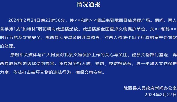 2024年2月24日晚23時56分,關(guān)××和陳××酒后來到隴西縣威遠樓廣場。期間,兩人各手持1支“加特林”煙花朝向威遠樓燃放。威遠樓系全國重點文物保護單位,關(guān)××和陳××的行為危及文物安全,隴西縣公安局及時開展調(diào)查,對兩人依法作出了行政拘留并處罰款的處理。