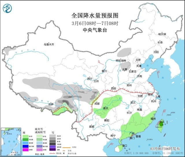 3月6日08時至7日08時,西藏東部和南部、青海南部、川西高原北部、山西北部等地部分地區(qū)有小雪或雨夾雪,其中,西藏東部、川西高原北部等地部分地區(qū)有中到大雪。江南東部和南部、西南地區(qū)東部、華南中東部、臺灣島等地部分地區(qū)有小雨,其中,臺灣島北部等地部分地區(qū)有中雨。內(nèi)蒙古西北部部分地區(qū)有4~5級風(見圖1)。