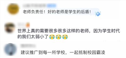 這位老師的做法,贏得了眾多網友的點贊:“好老師是學生的后盾”“一起抵制校園霸凌”。