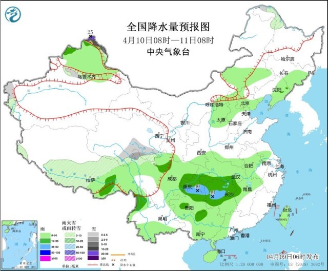 4月10日08時(shí)至11日08時(shí),新疆北疆北部、黑龍江西北部、西藏中部和北部、青海東南部、川西高原北部等地部分地區(qū)有小到中雪或雨夾雪,其中,新疆北疆北部高海拔地區(qū)有大到暴雪,局地大暴雪(20~25毫米)。內(nèi)蒙古東部、華北北部、東北地區(qū)東部、新疆北部、西藏東部、四川盆地大部、重慶、江淮西部、江漢、江南北部和西部、貴州大部、廣西大部、云南西部和南部、海南島、臺(tái)灣島等地部分地區(qū)有小到中雨,其中,重慶東南部、貴州北部、湖南中西部等地部分地區(qū)有大雨(25~40毫米)。新疆東部部分地區(qū)有6~7級(jí)風(fēng)。