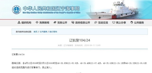 遼寧海事局發(fā)布航行警告,4月12日5時至5月31日0時,渤海部分海域?qū)⑦M行軍事演習。禁止駛?cè)搿?/p>