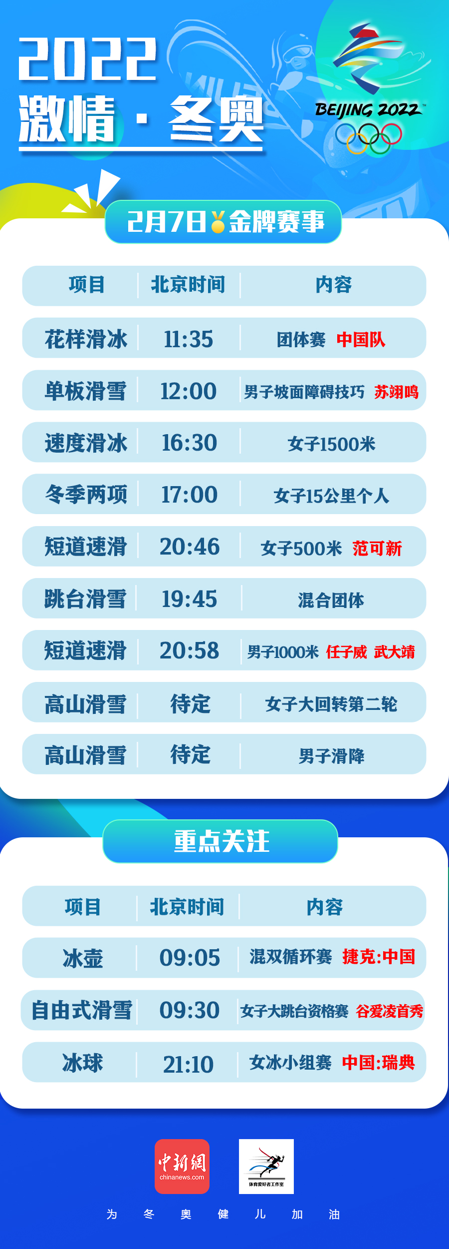 中新網(wǎng)2月7日電 蘇翊鳴爭冠、谷愛凌首秀、中國短道速滑再?zèng)_金、速度滑冰“冬奧獎(jiǎng)牌王”有望擴(kuò)大紀(jì)錄……7日的北京冬奧賽場,諸多看點(diǎn)值得期待。
