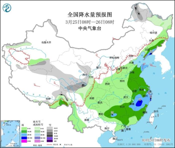 3月25日08時(shí)至26日08時(shí),內(nèi)蒙古東北部、黑龍江北部、新疆南疆盆地、西藏北部、青海中南部、甘肅西南部、川西高原北部等地的部分地區(qū)有小到中雪或雨夾雪,其中,內(nèi)蒙古東北部、黑龍江西北部、西藏東部等地的部分地區(qū)有大雪(5~9毫米)。吉林東南部、遼寧東部、山東中東部、江淮、江南大部、貴州東南部、華南北部等地的部分地區(qū)有中到大雨,其中,遼寧東部、江西北部、浙江西南部、福建西北部等地的部分地區(qū)暴雨(50~80毫米)。內(nèi)蒙古中西部、遼東半島、西藏北部、青海南部、陜西北部、山東半島、浙江北部等地的部分地區(qū)有4~6級風(fēng)(見圖3)。