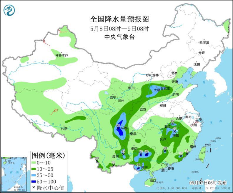 5月8日08時至9日08時,甘肅南部、陜西北部和西南部、山西中部、河北南部、四川盆地西部、貴州西部和南部、云南東部和南部、湖北東南部、江西、湖南東部和南部、廣西、廣東北部、福建南部等地的部分地區(qū)有中到大雨,其中,四川盆地西部和南部、廣西北部和南部等地局地暴雨(50~90毫米)。新疆北部、江南東部、西藏中北部等地的部分地區(qū)有4~6級風(fēng)(見圖2)。