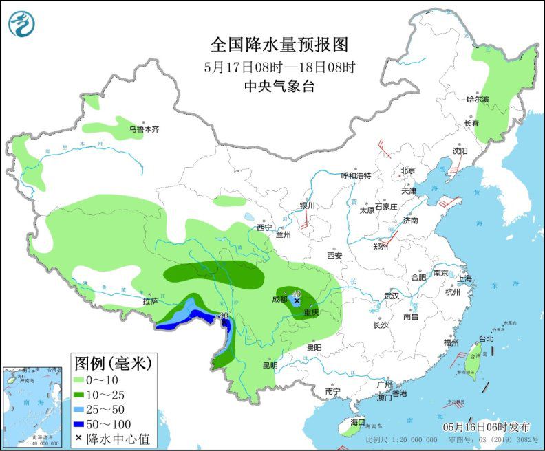 5月17日08時至18日08時,四川盆地南部、云南西部、青海南部、西藏東部等地部分地區(qū)有中到大雨,其中,西藏東南部、云南西北部等地部分地區(qū)有暴雨(50~90毫米)。東北地區(qū)南部、黃淮東部、內(nèi)蒙古中部等地部分地區(qū)有4~6級風(fēng)。黃海大部、臺灣海峽、南海東北部有5~7級、陣風(fēng)8級的風(fēng)。