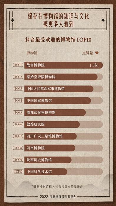 報(bào)告顯示,根據(jù)相關(guān)視頻點(diǎn)贊量排序,故宮博物院、秦始皇帝陵博物院、中國(guó)人民革命軍事博物館、中國(guó)國(guó)家博物館、成都武侯祠博物館等入選抖音最受歡迎十大博物館。其中,故宮博物院相關(guān)視頻被抖音網(wǎng)友點(diǎn)贊超過(guò)1.3億次。