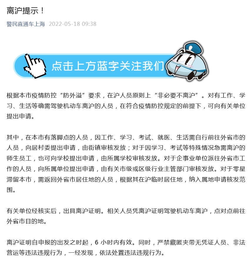 上海:確需駕車離滬人員可提出申請(qǐng) 離滬證明6小時(shí)內(nèi)有效