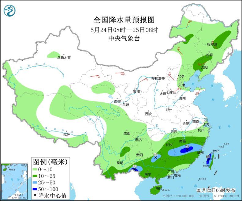 5月24日08時至25日08時,西藏北部和西部、青海南部、川西高原等地有小雨或陣雨,高海拔地區(qū)有小到中雪或雨夾雪;江南中南部、華南大部、云南南部、黑龍江東部、遼寧中部、臺灣島等地部分地區(qū)有中到大雨,其中,江西南部、福建西部、云南東南部、廣西西南部、臺灣島西部等地部分地區(qū)有暴雨(50~75毫米)。東北地區(qū)中南部、華北北部和東部、黃淮北部和東部、內蒙古、甘肅北部等地部分地區(qū)有4~6級風,內蒙古西部部分地區(qū)有6~7級風。