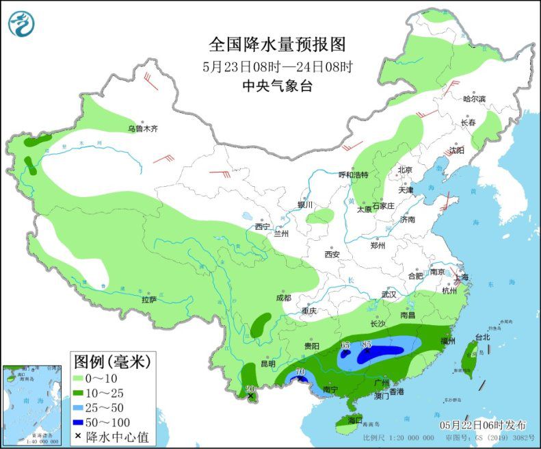 5月22日08時至23日08時,西藏、青海西南部等地有小雨或陣雨,高海拔地區(qū)有小到中雪或雨夾雪;江南東部和南部、華南大部、貴州中南部、云南南部、黑龍江西北部等地部分地區(qū)有中到大雨,其中,云南南部、貴州南部、廣西北部、湖南南部、廣東西南部沿海等地部分地區(qū)有暴雨(50~90毫米)。新疆北部和南疆東部、甘肅北部、內蒙古西部和東部等地部分地區(qū)有4~6級風。