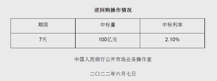 央行6月7日開展100億元逆回購操作 中標(biāo)利率2.10%