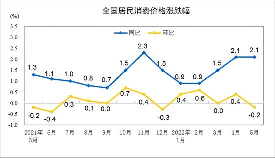 中新財經(jīng)6月10日電 國家統(tǒng)計局10日公布數(shù)據(jù)顯示,2022年5月份,全國居民消費價格(CPI)同比上漲2.1%。其中,食品價格上漲2.3%,非食品價格上漲2.1%。