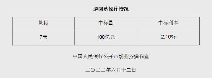央行6月13日開展100億元逆回購操作 中標(biāo)利率2.10%